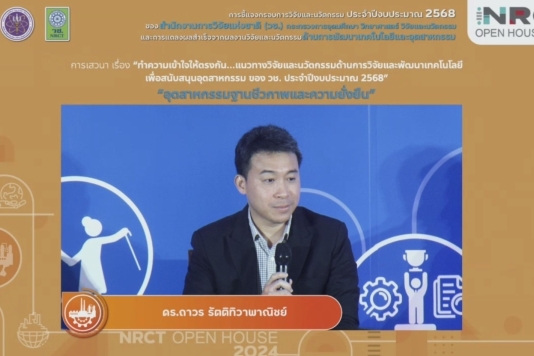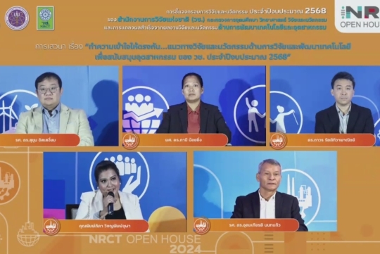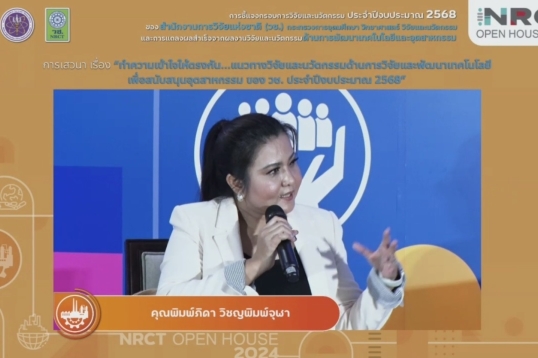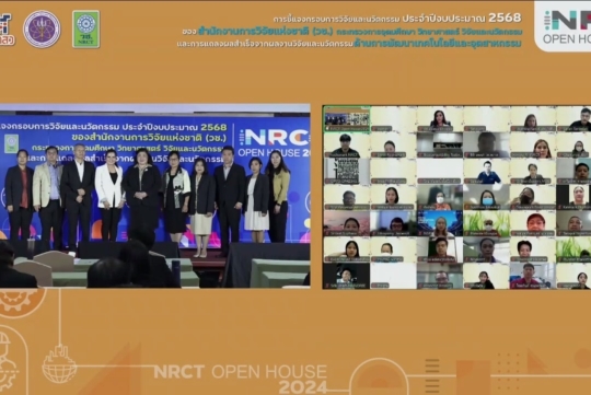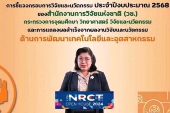 วันที่ 6 มิถุนายน 2567 สำนักงานการวิจัยแห่งชาติ (วช.) กระทรวงการอุดมศึกษา วิทยาศาสตร์ วิจัยและนวัตกรรม จัดการประชุมชี้แจงกรอบการวิจัยและนวัตกรรม ประจำปีงบประมาณ 2568 และแถลงผลสำเร็จจากการวิจัยและนวัตกรรม NRCT Open House 2024 โดยมี ดร.วิภารัตน์ ดีอ่อง ผู้อำนวยการสำนักงานการวิจัยแห่งชาติ เป็นประธานเปิดการประชุมฯ เพื่อประชาสัมพันธ์เกี่ยวกับการรับข้อเสนอการวิจัยและนวัตกรรม และกรอบการวิจัยและนวัตกรรมที่ วช. ให้การสนับสนุนทุนการวิจัยและนวัตกรรม ประจำปีงบประมาณ 2568