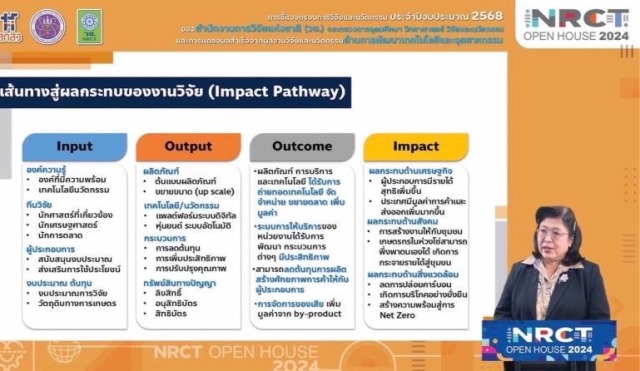 ดร.วิภารัตน์ ดีอ่อง ผู้อำนวยการสำนักงานการวิจัยแห่งชาติ กล่าวว่า วช. มุ่งเน้นสร้างการรับรู้ ความเข้าใจ เตรียมความพร้อม ให้แก่ประชาคมวิจัยในการจัดทำข้อเสนอสำหรับการวิจัยและนวัตกรรม เพื่อขอรับทุนประจำปีงบประมาณ พ.ศ. 2568 วช. มุ่งมั่นสนับสนุนให้เกิดการขยายเครือข่ายวิจัยที่มีประสิทธิภาพสูง ซึ่งในด้านการพัฒนาเทคโนโลยีและอุตสาหกรรม ในสถานการณ์ปัจจุบันองค์การสหประชาชาติ (UN) ให้ความสำคัญเกี่ยวกับปัญหาด้านมลพิษที่เกิดจากภาคอุตสาหกรรม จึงมีการกำหนดมาตรการปรับคาร์บอนก่อนเข้าพรมแดน (Carbon Border Adjustment Mechanism: CBAM) ขึ้น ให้เป็นมาตรการสำคัญในการบรรลุเป้าหมาย Net Zero Emissions ในปี 2050 วช. ให้ความสำคัญกับขีดความสามารถของผู้ประกอบการและนักวิจัยเพื่อให้สอดคล้องกับองค์กรระดับนานาชาติ โดยเพิ่มประสิทธิภาพโรงงานหรือบริษัท ปรับโครงสร้างพลังงานโดยเพิ่มสัดส่วนพลังงานทดแทน เพิ่มการหมุนเวียนวัสดุ และใช้เทคโนโลยีกักเก็บและใช้งานประโยชน์คาร์บอนและใช้การกักเก็บคาร์บอนด้วยวิถีธรรมชาติ ควบคู่ไปกับการส่งเสริมธุรกิจขนาดย่อมให้ยกระดับความสามารถ เพิ่มรายได้ เพิ่มมูลค่าให้แก่สินค้า และปรับเปลี่ยนกลไกการผลิตให้เป็นมิตรต่อสิ่งแวดล้อม โดยนำองค์ความรู้ด้านเทคโนโลยี วิจัย และนวัตกรรมมาประยุกต์ใช้ รวมไปถึงการพัฒนาด้วยการนำ AI มาใช้ประโยชน์กับภาคอุตสาหกรรมในอนาคต